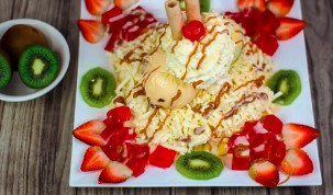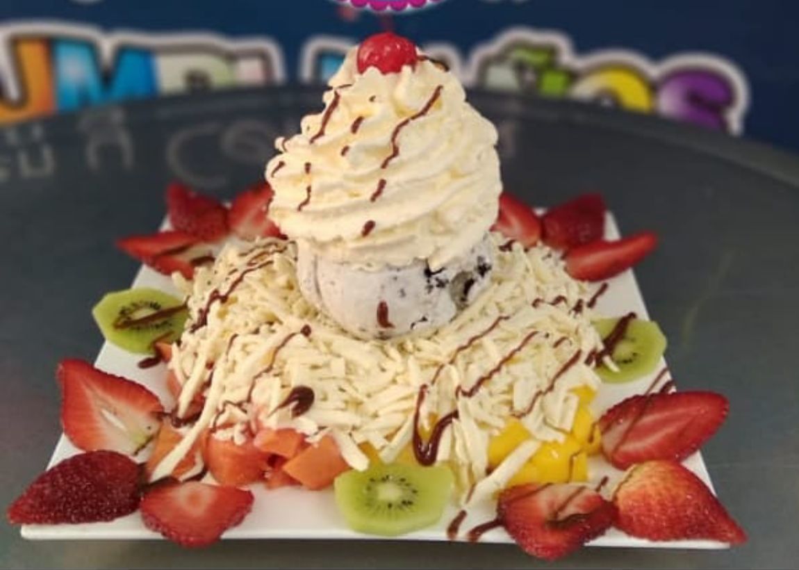 Ensalada con 2 bolas de helado, sabores a elegir, melón, kiwi, papaya, banano, mango, fresas, manzana, gelatina, queso, crema de leche, lechera, barquillos, cereza y chantilly.