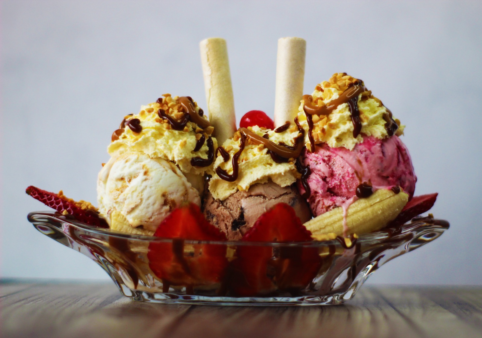 Banano con 3 bolas de helado, sabores a elegir, fresas, maní, barquillos, cereza, chantilly, salsa de arequipe y chocolate.