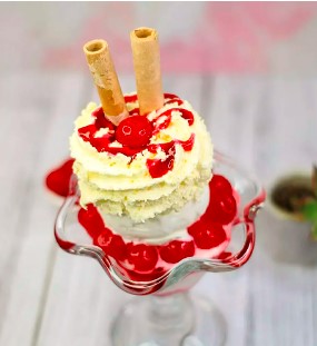 Copa con 2 bolas de helado de vainilla, cerezas, salsa de mora, barquillos y chantilly.