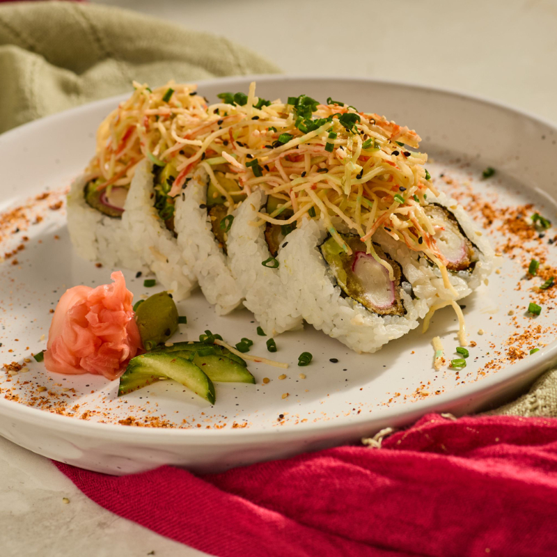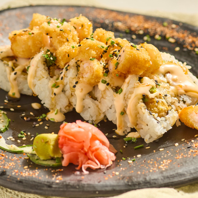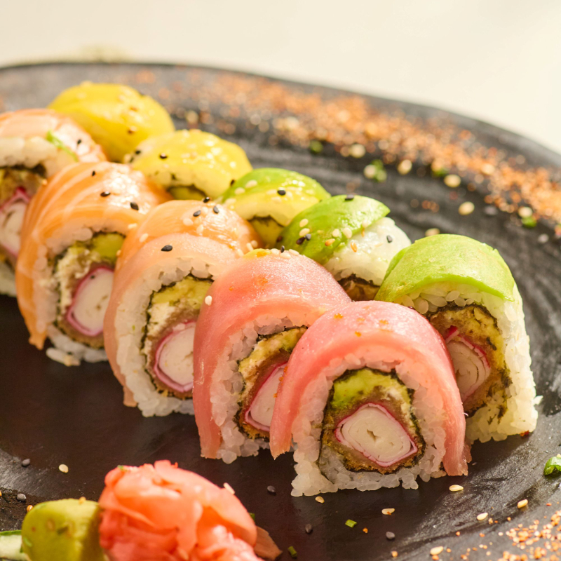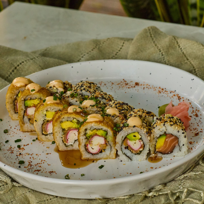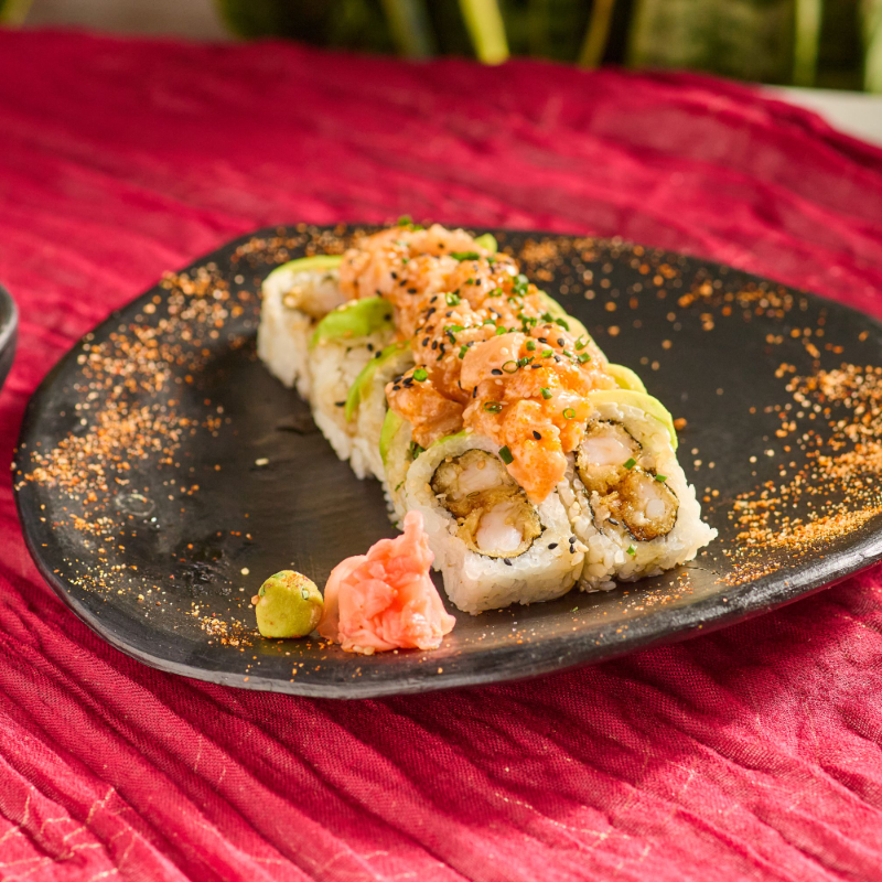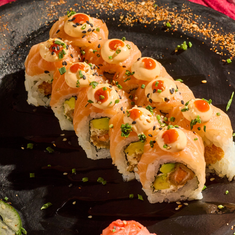 Roll a base de cangrejo apanado, queso crema y pepino, finalizado con topping de salmón, tilapia, aguacate y masago.