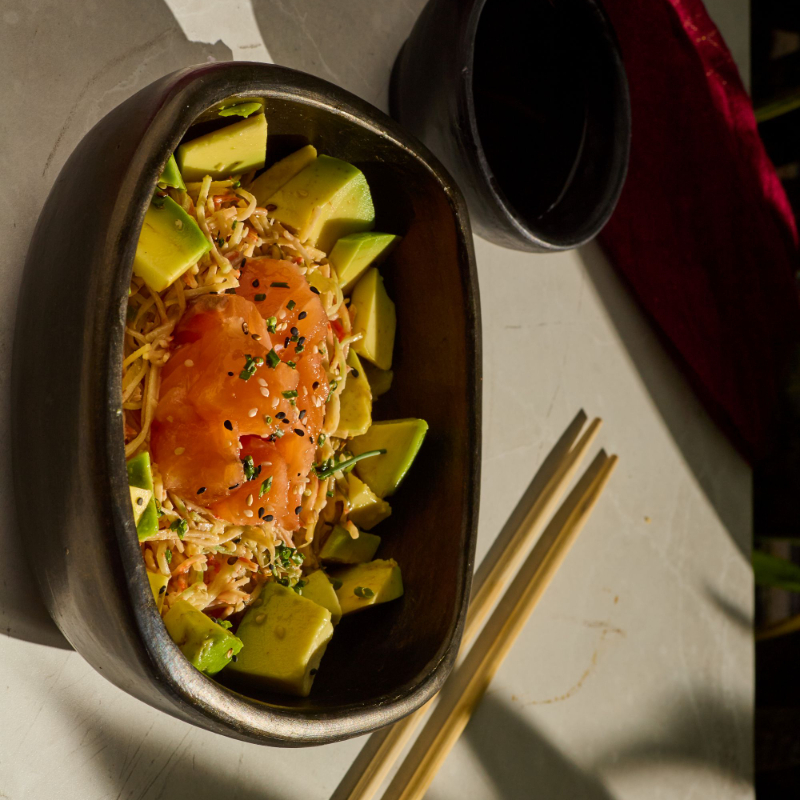Cangrejo desmechado, sewed salad, aguacate, salmon fresco. Finalizado con teriyaki, cebolin y ajonjoli