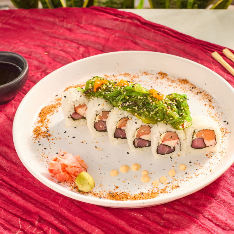 Roll de salmon fresco, kanikama , aguacate y tilapia,finalizado con wakame