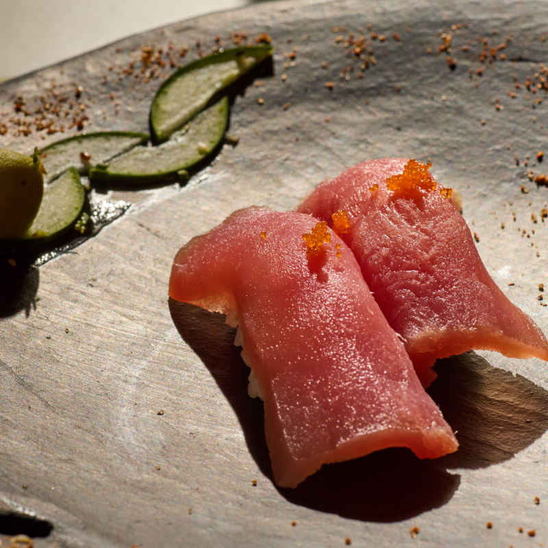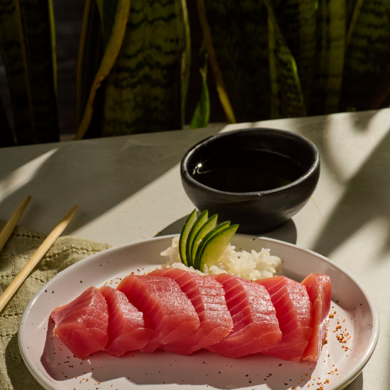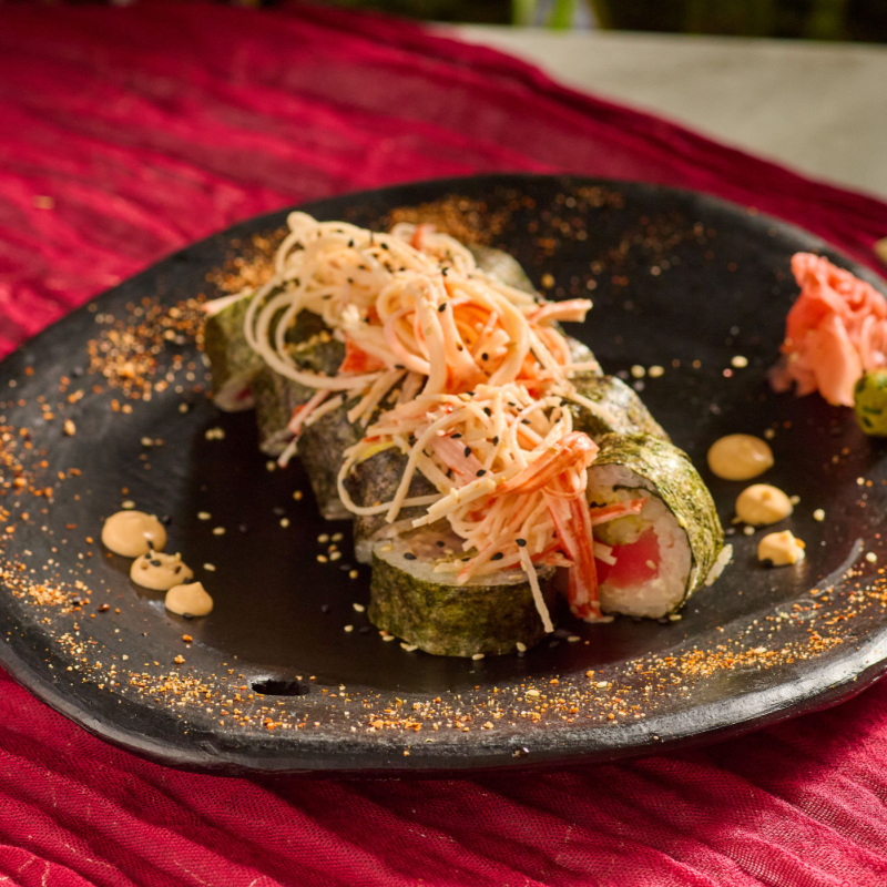 Deliciosa combinacion de atun maguro, queso crema, aguacate y kani spicy (limon, siracha, aceite de ajinjoli) bañado en finos cortes de cebollin y ajonjoli