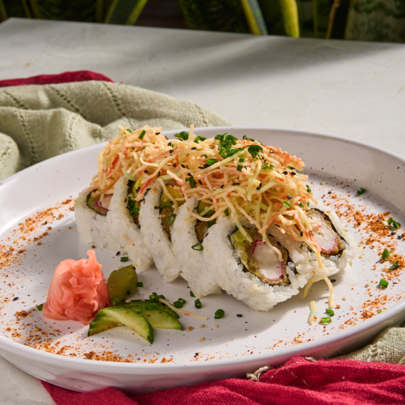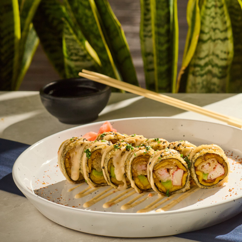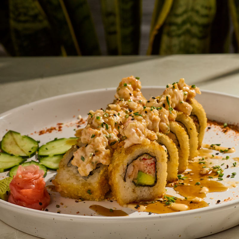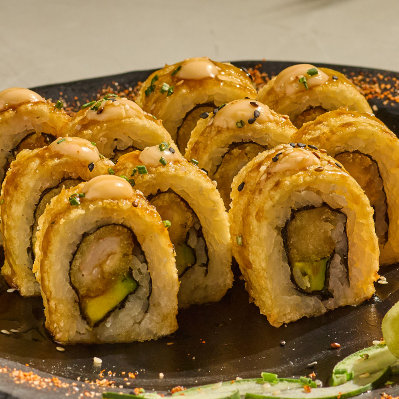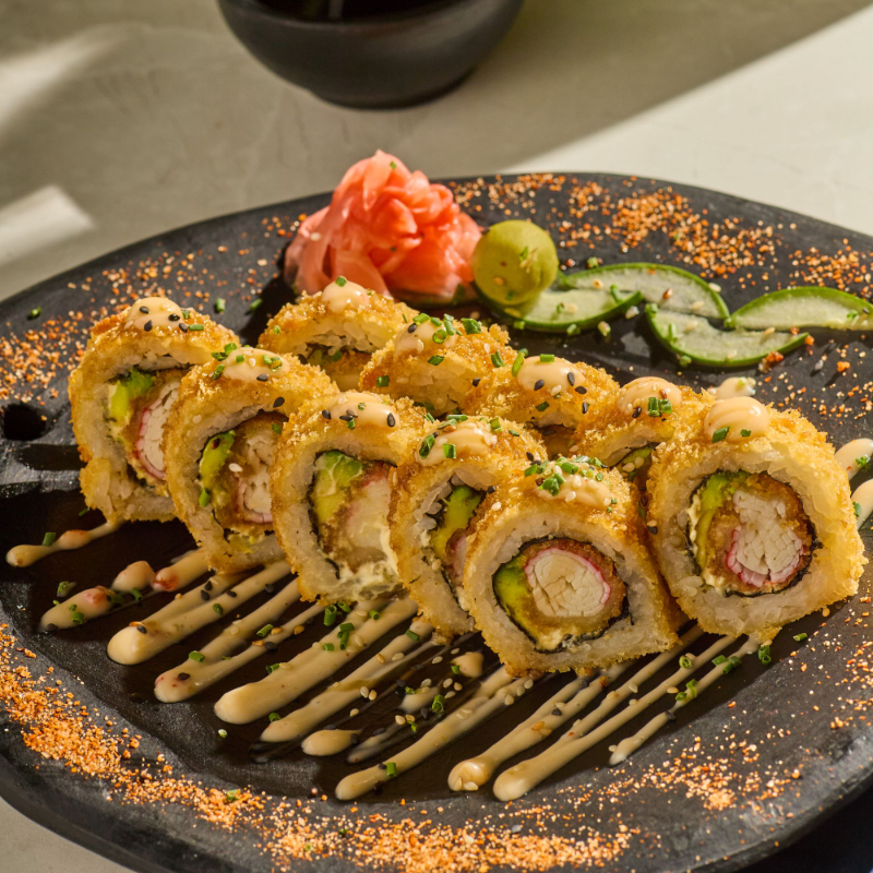 Palmitos de Cangrejo, queso crema, aguacate, finalizado en salsa dragón y teriyaki. Roll tempurizado