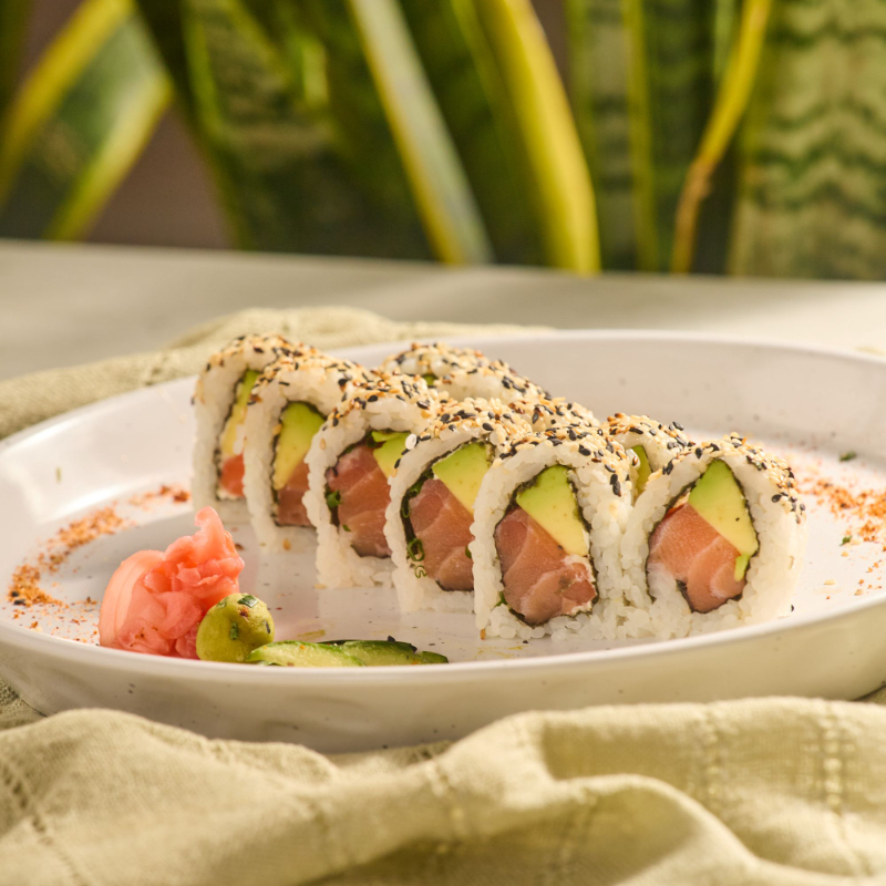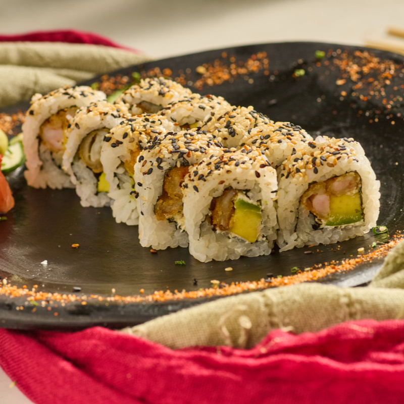 Salmón apanado, queso crema y aguacate, finalizado con ajonjolí de topping.