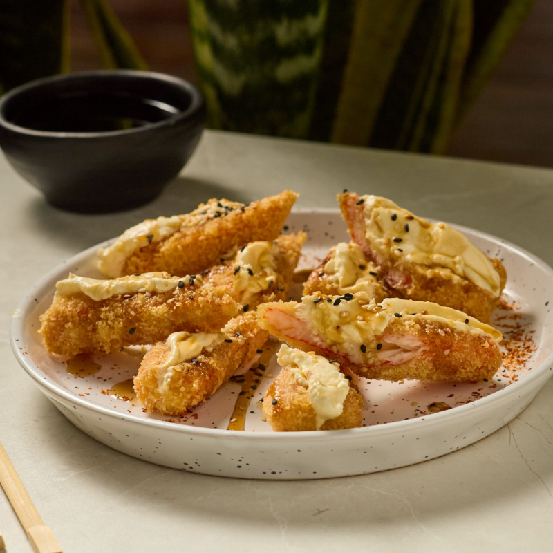 Crujientes bastones de kani con queso crema, panko y salsa teriyaki.