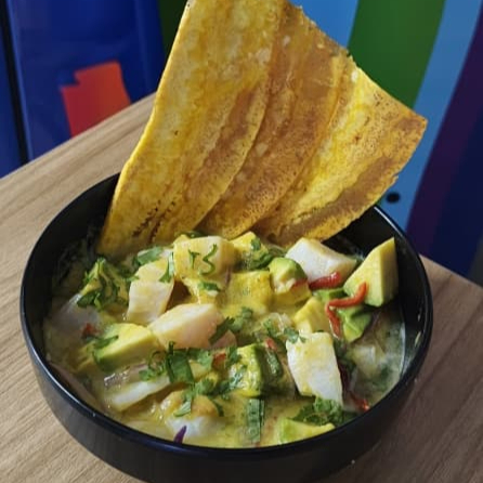 200 gr de pesca blanca, mezclados y marinados en aji amarillo, acompañado de chips de platano verde, finalizado con cilantro. (picante medio)