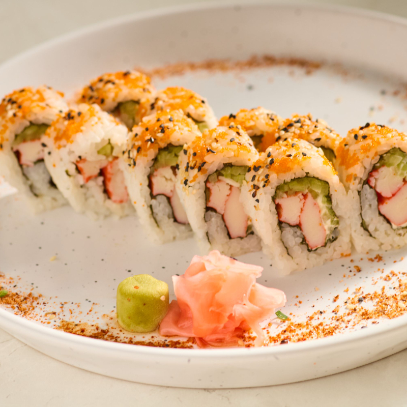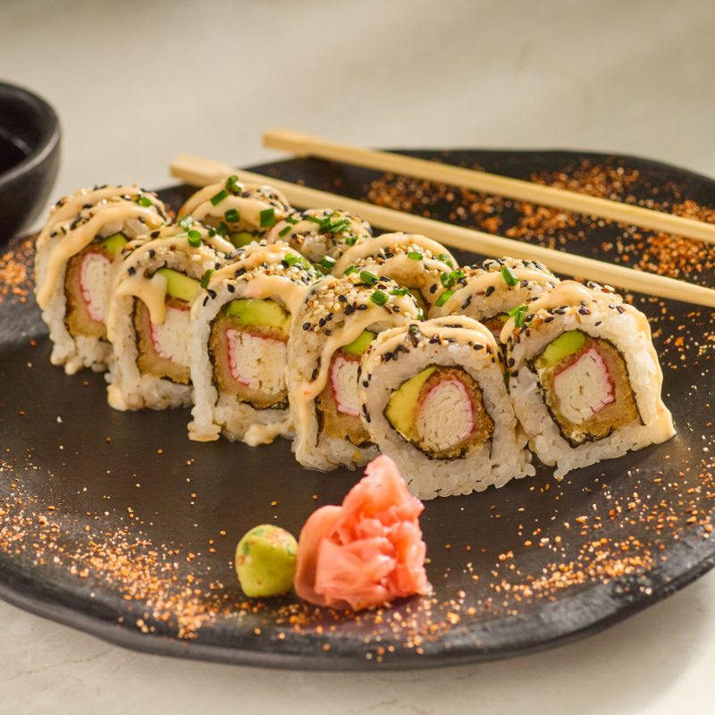 Roll a base de cangrejo, queso crema y aguacate, finalizado con salsa dinamita de la casa (kani, masago, wakame).