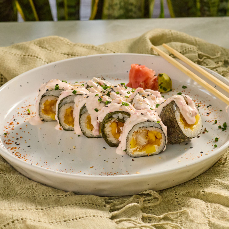 Sushi tradicional al estilo de la casa , exquisita combinacion de canicama ,queso crema y mango, bañado en un topping de masago
