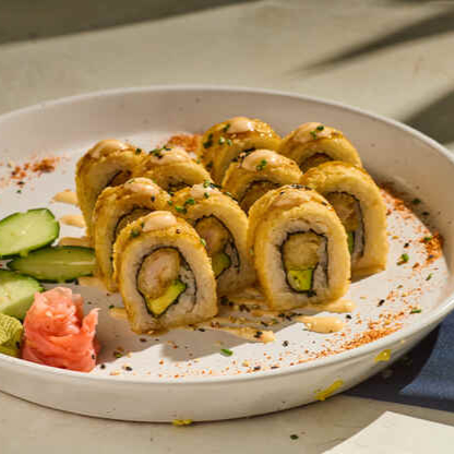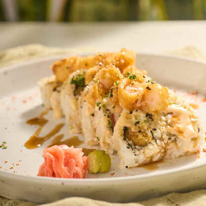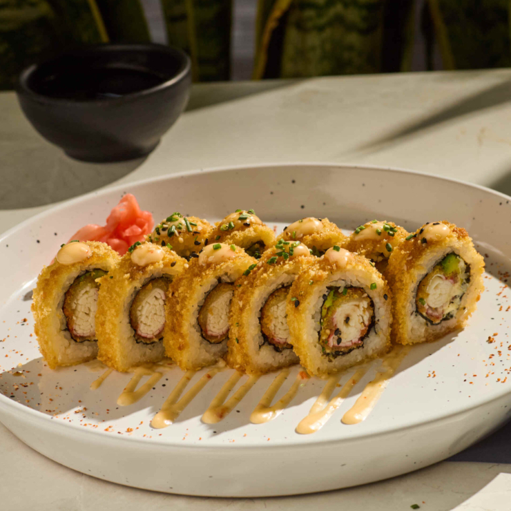 Delicioso roll apanado a base de plátano maduro, queso crema, palmitos, camarones apanados, finalizado con una salsa dragón de la casa.
