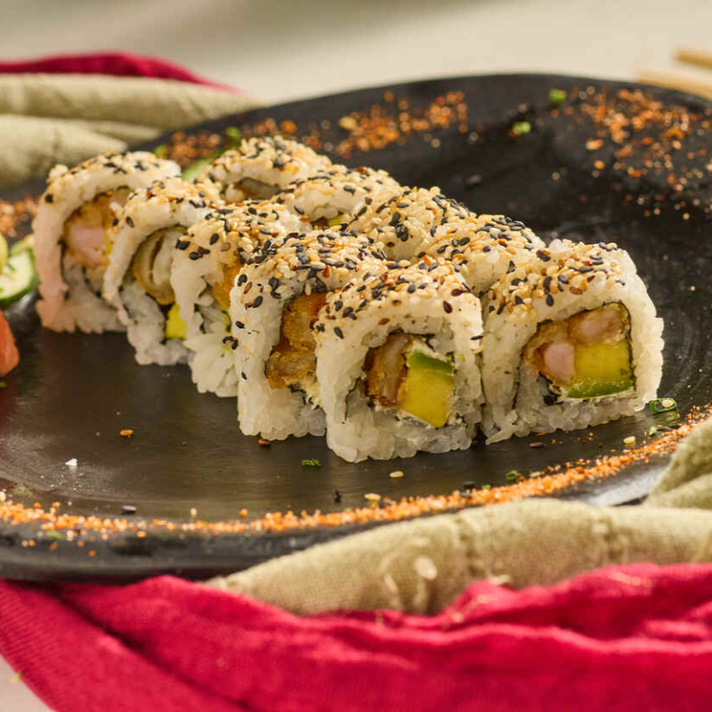 Sushi de kanikama, queso crema, aguacate, finalizado con ajonjolí y camarones apanados.