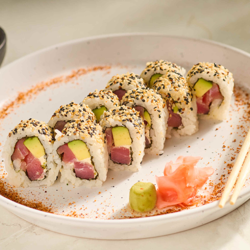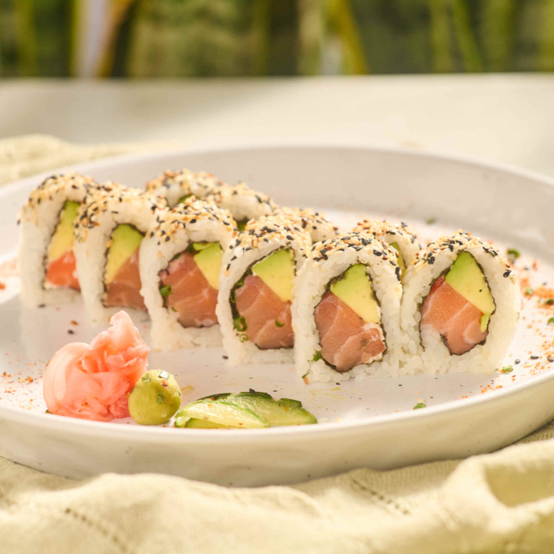 Roll clásico philadelphia al estilo hamachi, salmón fresco, queso crema, aguacate, finalizado con ajonjolí.