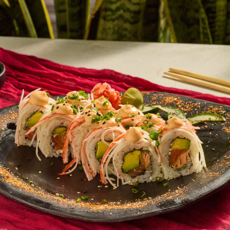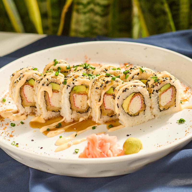 Cangrejo, queso crema, aguacate, finalizado con ajonjolí encontrado y salsa de la casa.