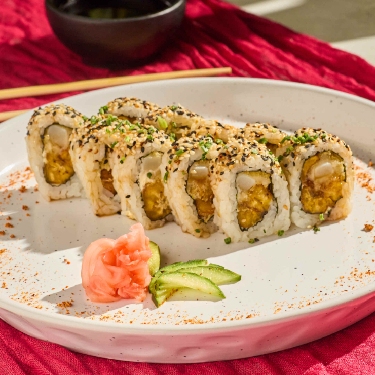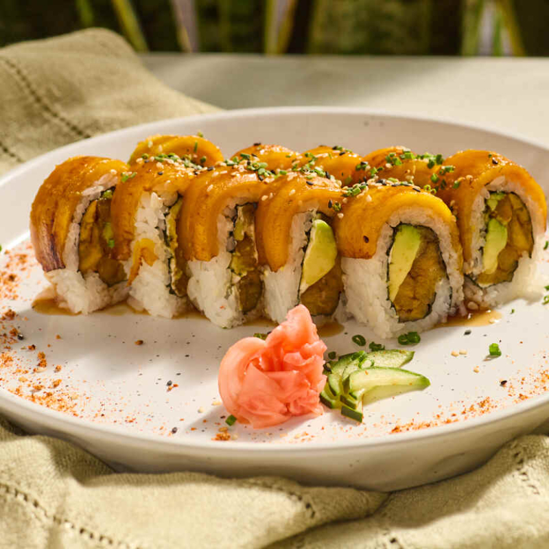 Sushi de tilapia apanada, queso crema, aguacate, topping de plátano maduro.