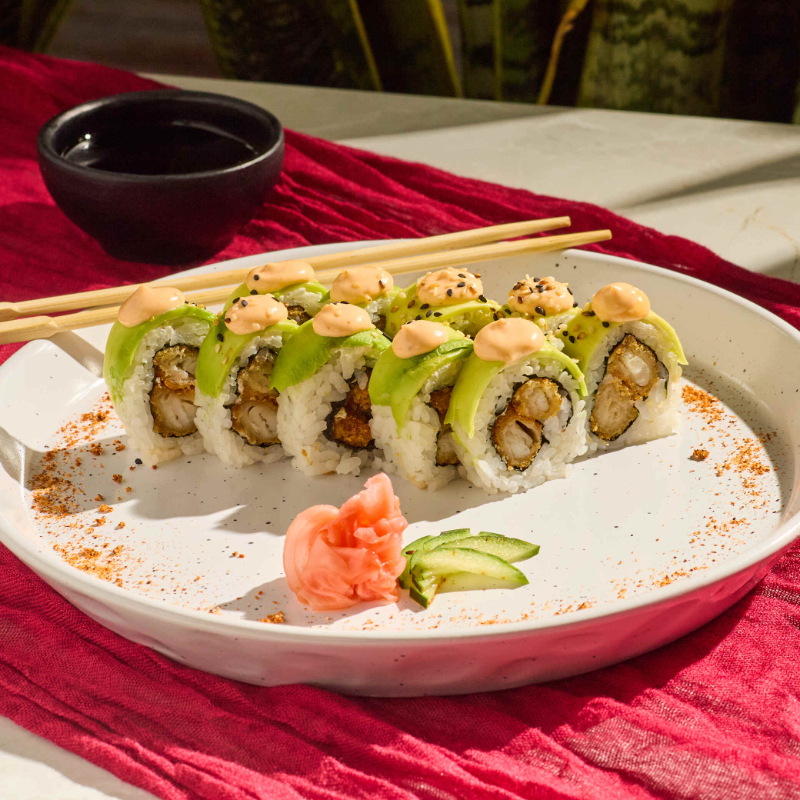 Langostino encontrado en panco, queso crema, aguacate (apanado), salsa dragón y teriyaki.