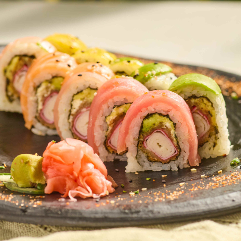 Sushi tradicional al estilo hamachi sushi, kanikama, queso crema, pepino y topping de masago.