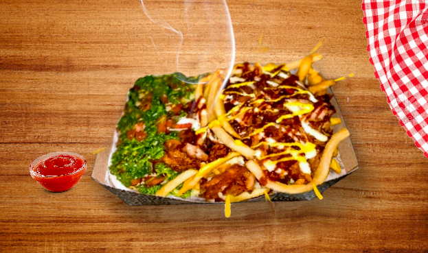 ¡Una bomba de sabor! 400 gramos de papas a la francesa bien crocantes, cubiertas con queso mozzarella derretido, más 180 gramos de carne al trompo bien jugosita. para rematar, le metemos ensalada fresca o tabule.