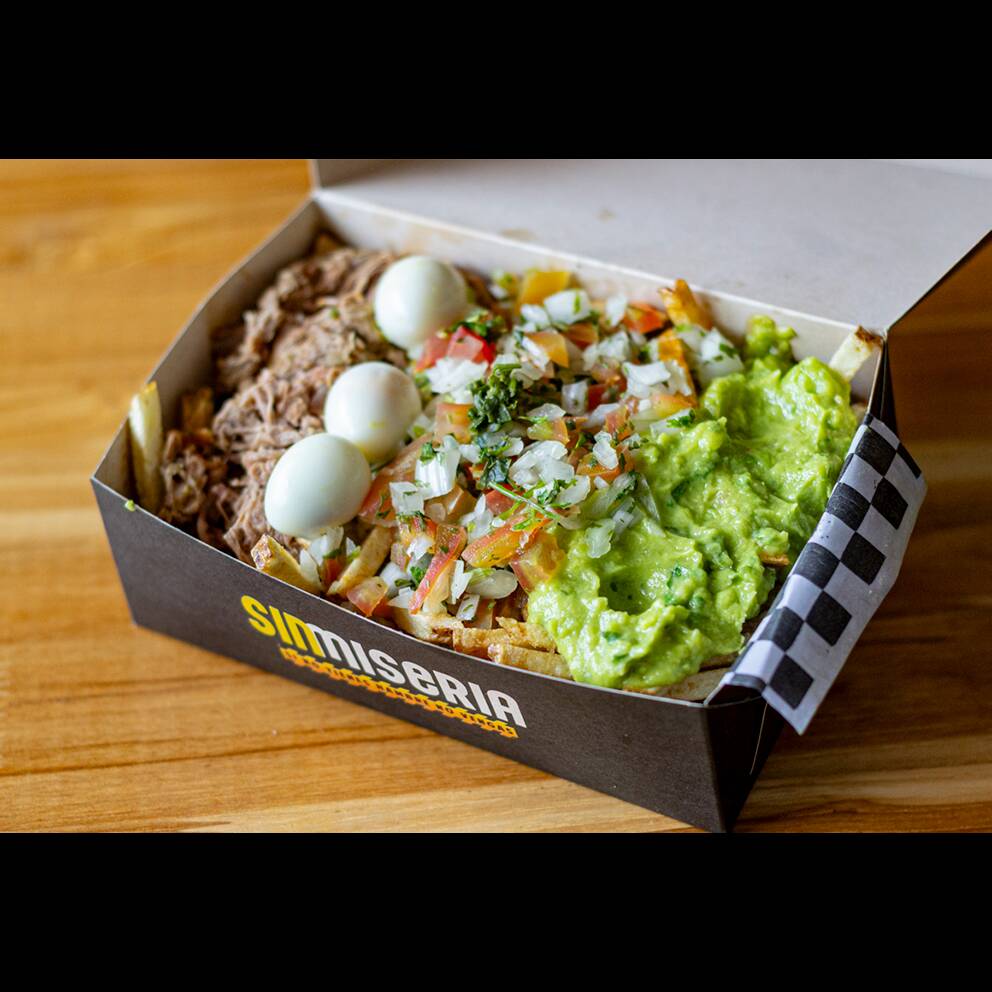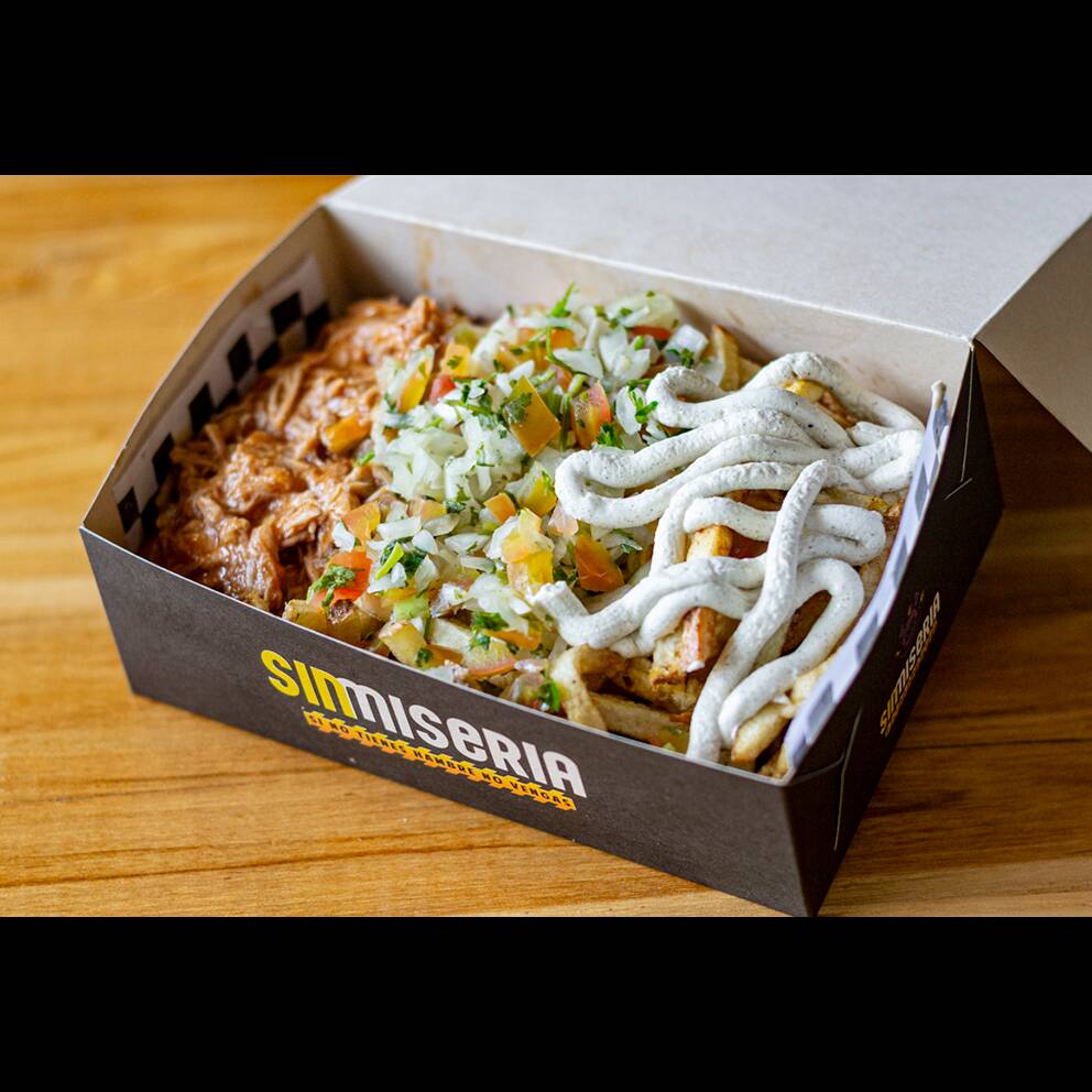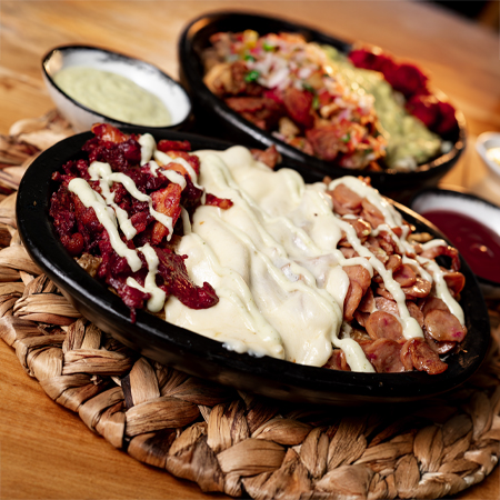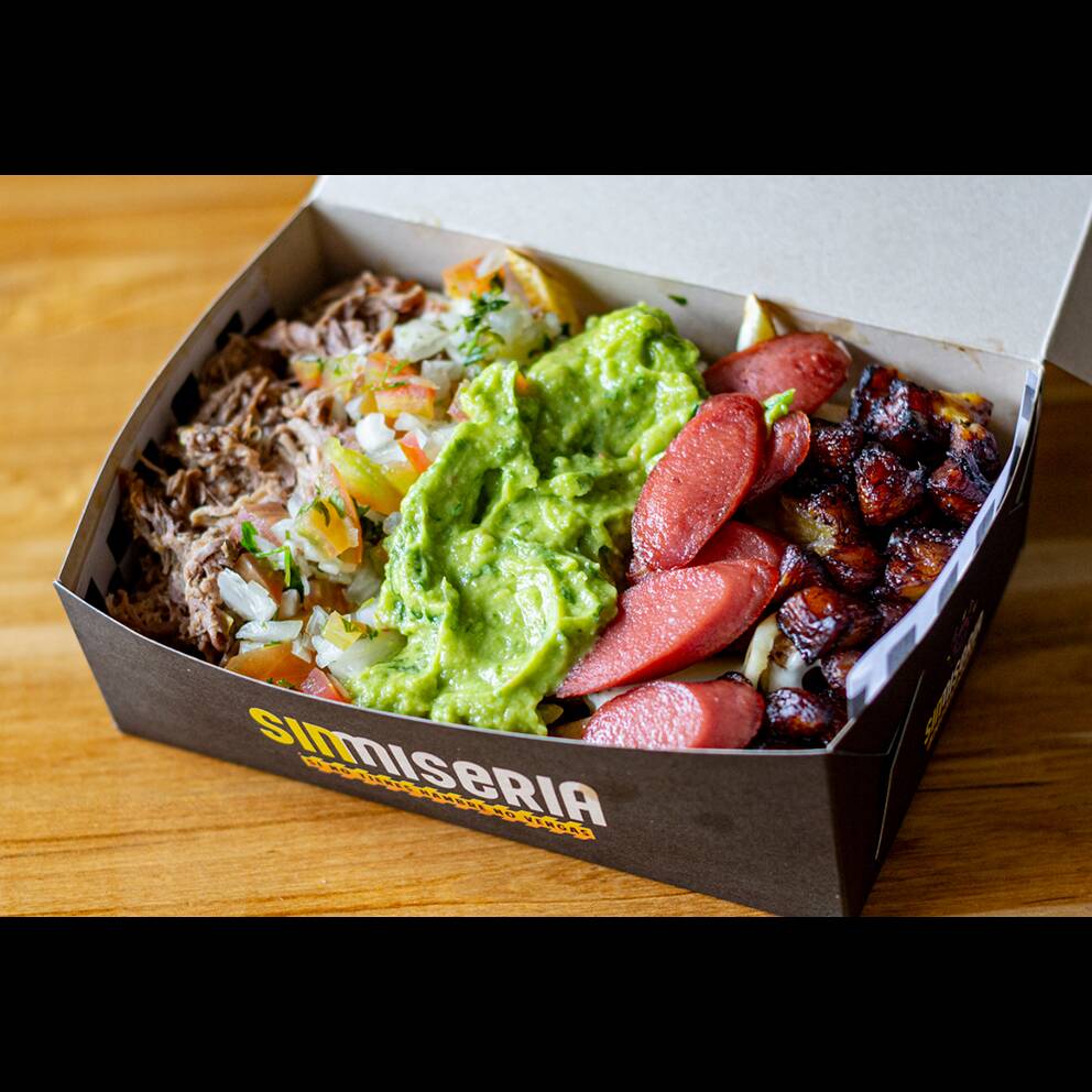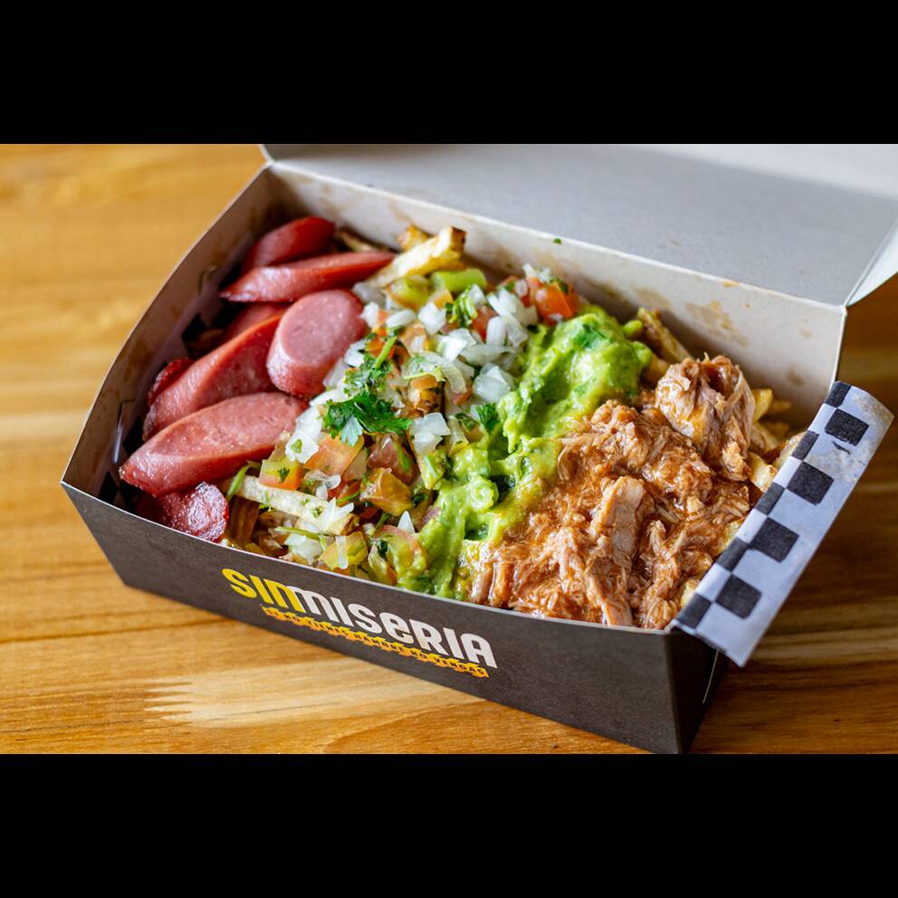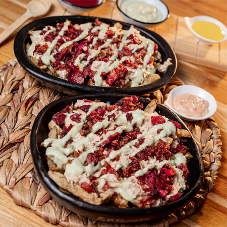 Papas artesanales, salchicha americana, pulle pork, guacamole, pico de gallo, salsa de la casa.
