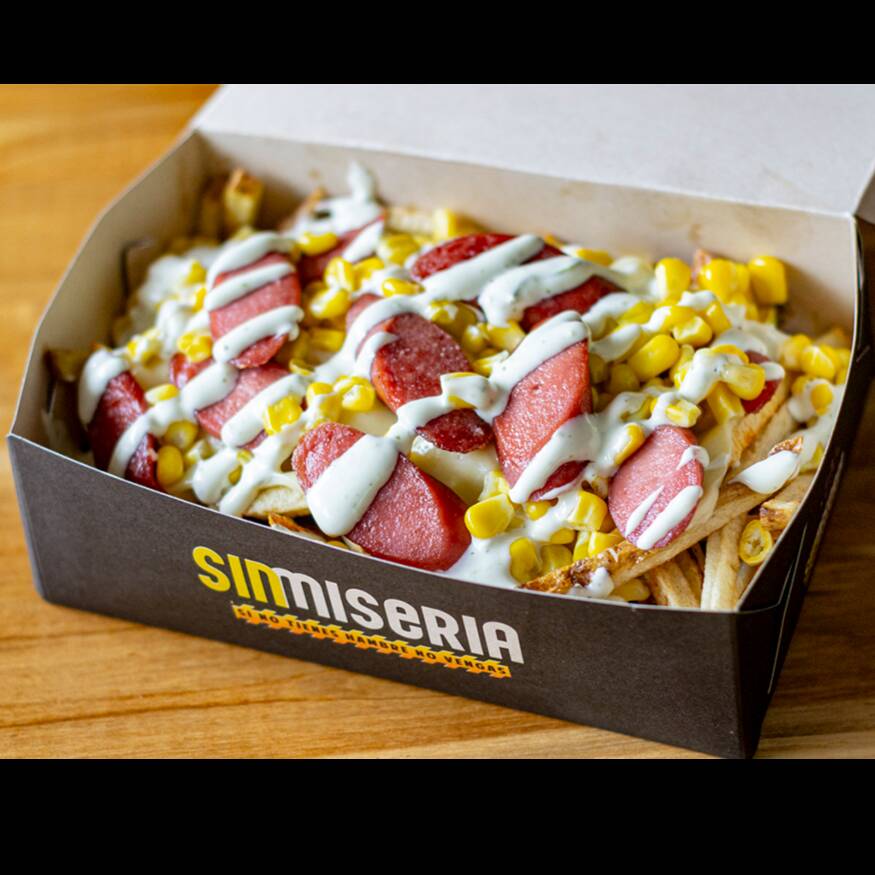 Papas artesanales, queso mozzarella, salchicha americana, salsas de la casa, lluvia de maicitos.