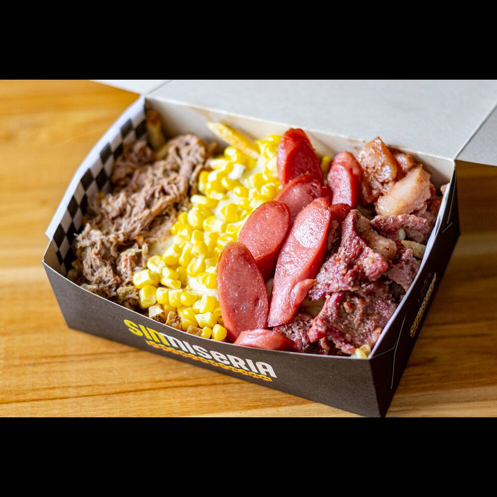 Papas artesanales, carne de la casa, salchicha americana, tocineta, salsas de la casa, queso mozzarella, lluvia de maicitos.