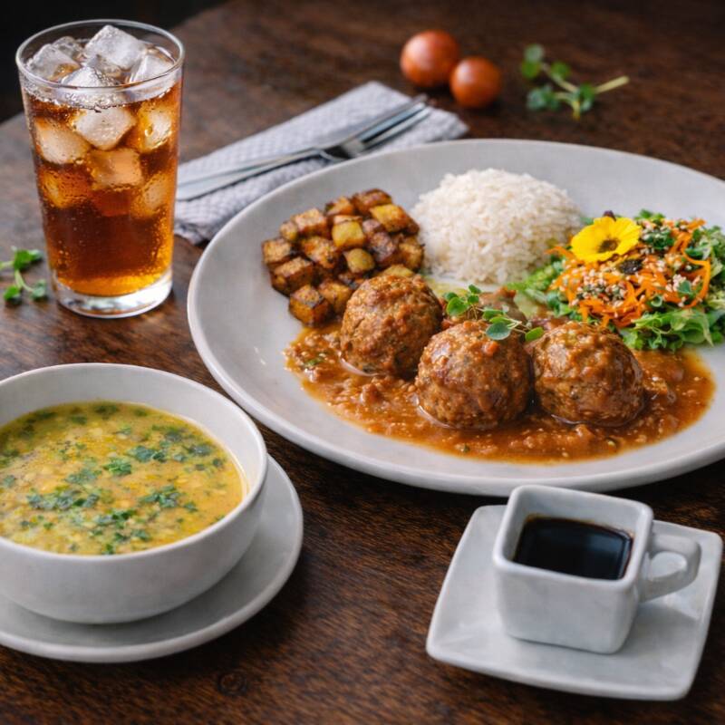 Delicioso almuerzo casero con albóndigas de res en salsa criolla, sopa de verduras, acompañado con maduritos, tu arroz favorito, ensalada de la casa, un refrescante guandolo y cafe americano para tener una experiencia completa de almuerzo