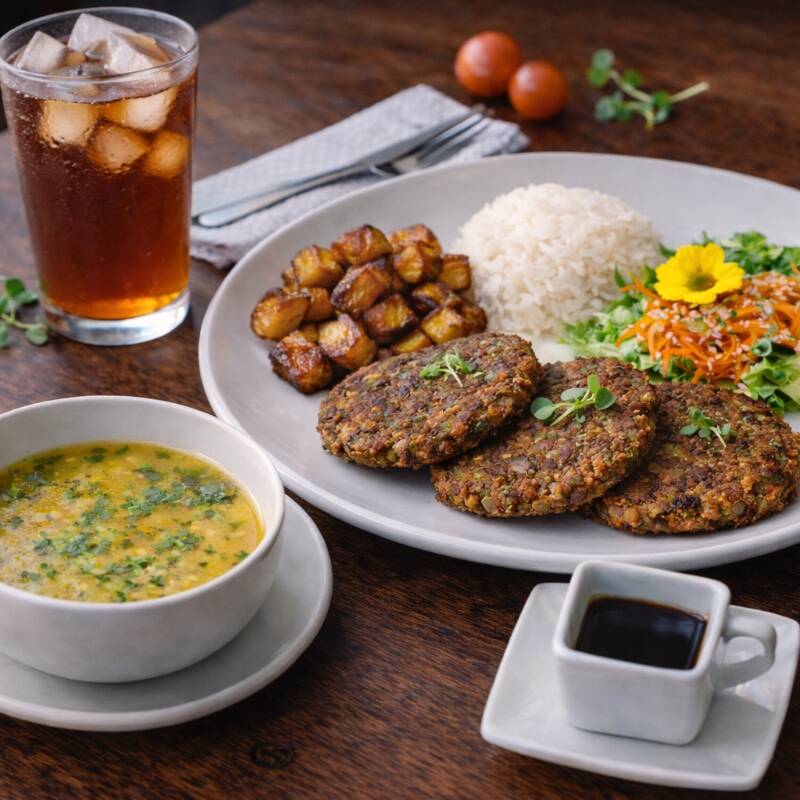 Delicioso almuerzo casero con hamburguesas de lentejas, sopa de verduras, acompañado con maduritos, tu arroz favorito, ensalada de la casa, un refrescante guandolo y cafe americano para tener una experiencia completa de almuerzo