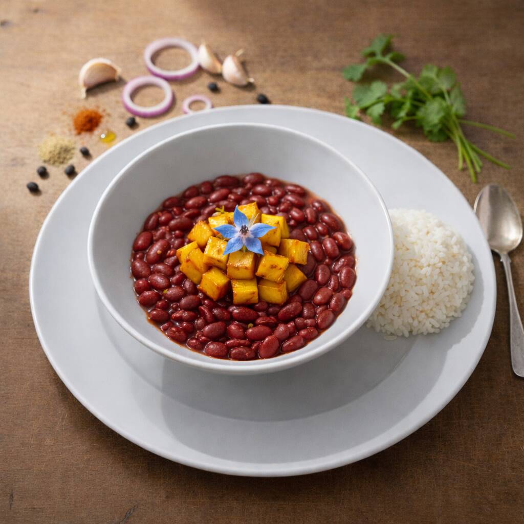 Una reconfortante sopa de frijol rojo preparados lentamente y pimentón dulce, y zanahoria finalizada con maduritos en cubos y cilantro fresco para un balance rico, vibrante y lleno de calidez. Adicionalmente tendrás una porción de tu arroz favorito para lograr una experiencia más completa