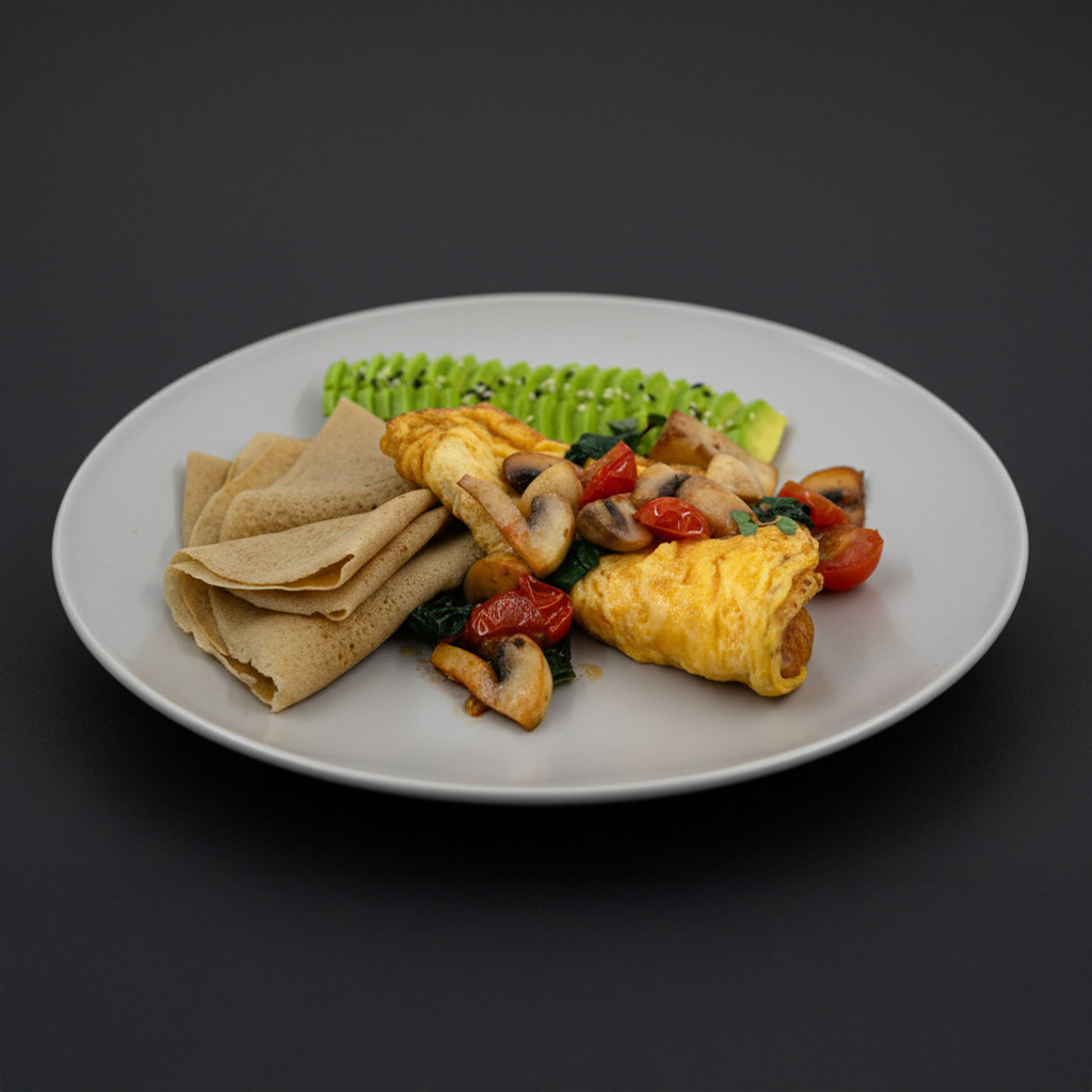 Un plato nutritivo de champiñones y espinaca salteados con huevos suaves y crêpes de avena sustanciosos, finalizado con tomates cherry, brotes frescos y una delicada pizca de semillas de sésamo para energía y fuerza sostenida.