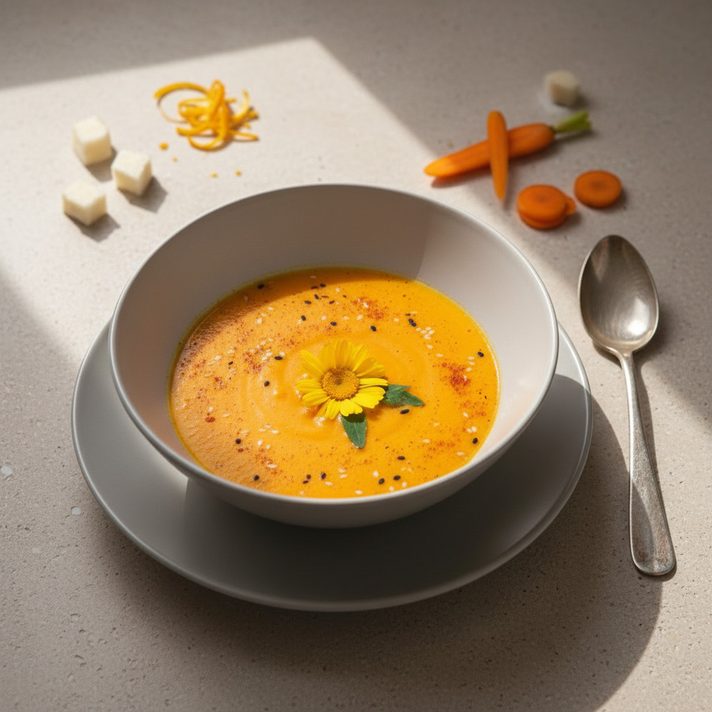 Una crema sedosa de zanahoria realzada con un toque de naranja, suavemente avivada con salsa Tabasco y finalizada con brotes frescos, creando un balance vibrante de dulzura, cítricos y un leve picante.