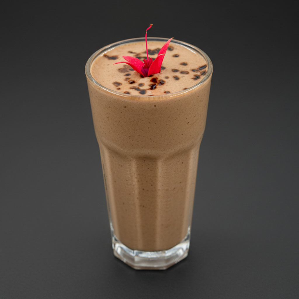 Cremoso shake de proteína total whey con extracto de café, endulzado con dátiles, preparado con leche de almendras sin azúcar y coronado con café liofilizado