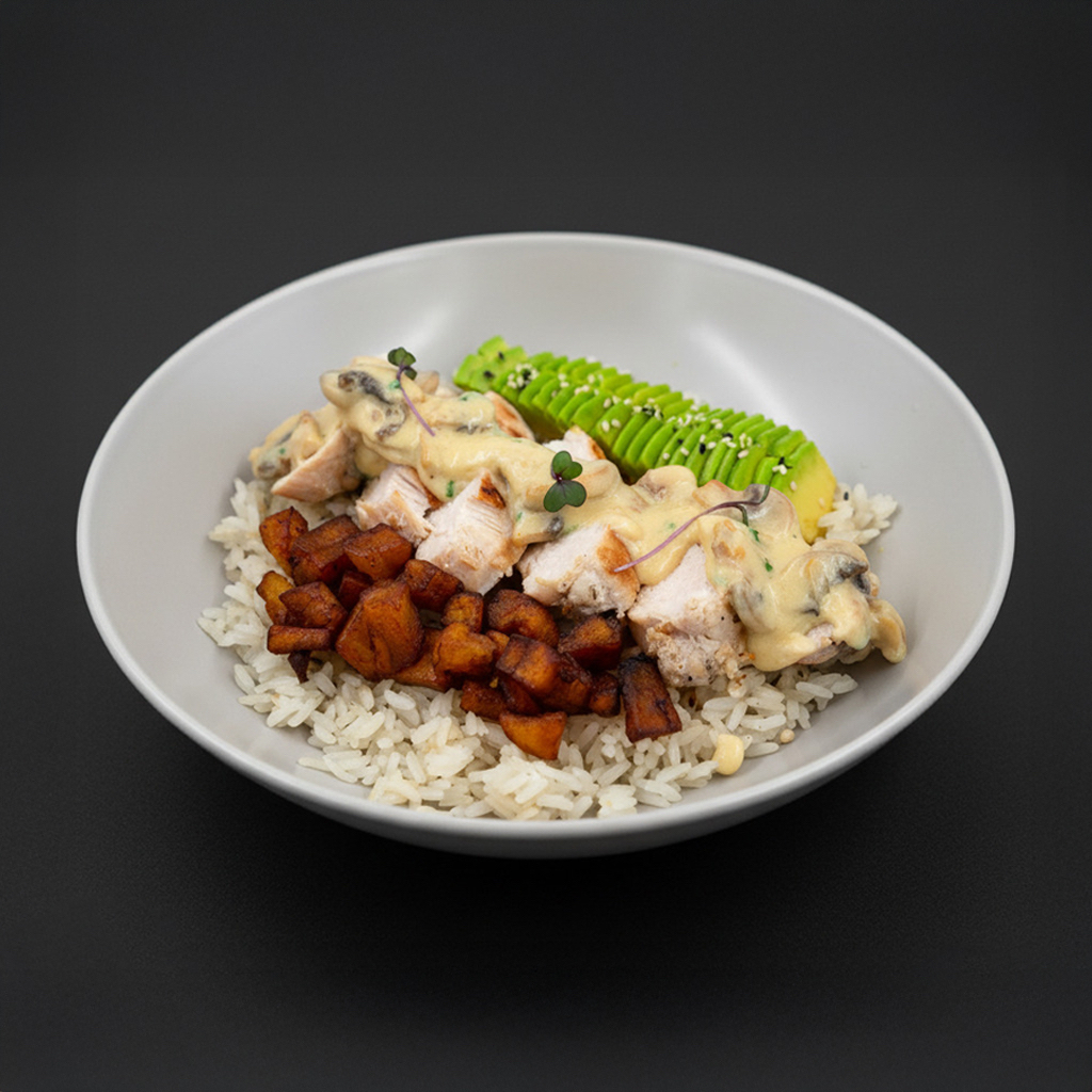Arroz premium blanco o integral cubierto con pollo tierno en salsa cremosa de champiñones, acompañado de tomates cherry y plátano maduro en cubos, y finalizado con brotes frescos para un plato reconfortante y bien balanceado.