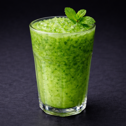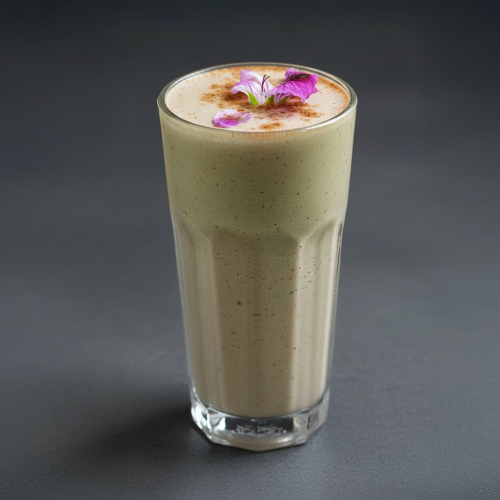 Cremoso shake de proteína total whey con matcha, endulzado con dátiles, preparado con leche de almendras sin azúcar y coronado con canela