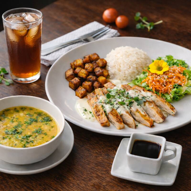 Delicioso almuerzo casero con pechuga en salsa cremosa de cilantro, sopa de verduras, acompañado con maduritos, tu arroz favorito, ensalada de la casa, un refrescante guandolo y cafe americano para tener una experiencia completa de almuerzo
