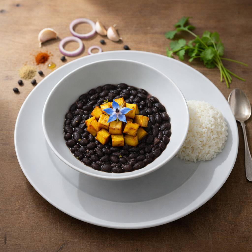 Una reconfortante sopa de frijol negro preparada con caraotas cocidas lentamente y pimentón dulce, finalizada con maduritos en cubos y cilantro fresco para un balance rico, vibrante y lleno de calidez. Adicionalmente tendrás una porción de tu arroz favorito para lograr una experiencia más completa.