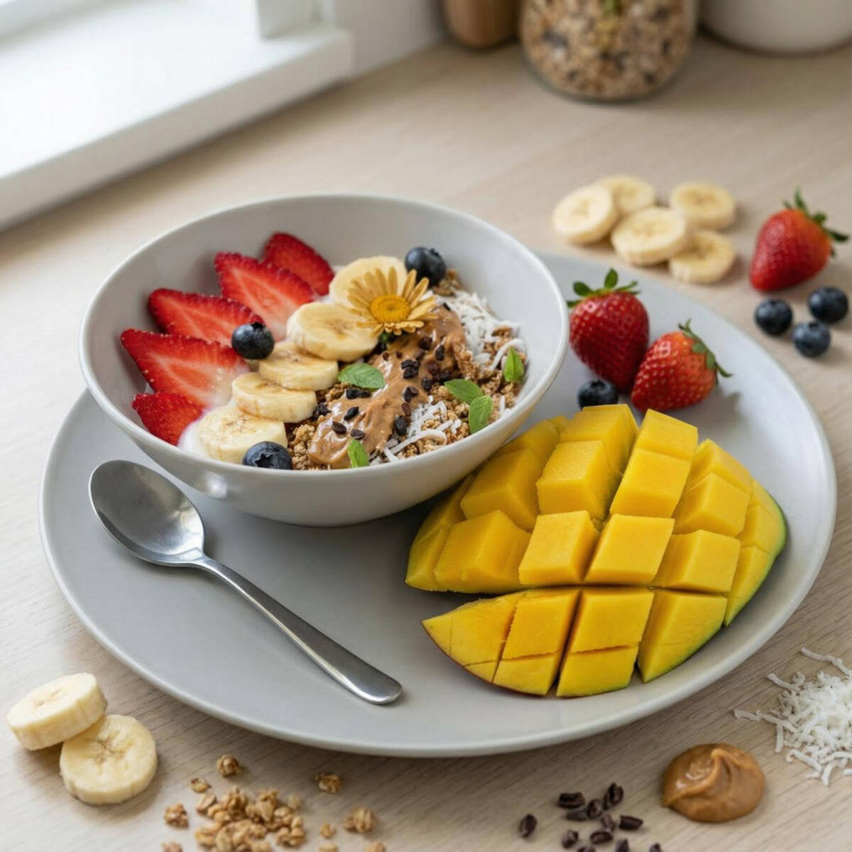 Una combinación de yogur orgánico sin azúcar añadida con capas de frutas de temporada (mango. banano, coco, arandanos), fresas deshidratadas acompañado con granola, y finalizado con mantequilla de maní y nibs de cacao para un balance naturalmente nutritivo y satisfactorio de frescura, crocancia y cremosidad.