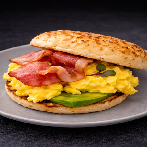 Delicioso beagle de queso parmesano, acompañado con una base de aguacate en abanico , huevos revueltos, tocineta crujiente y coronados con delicados brotes vegetales