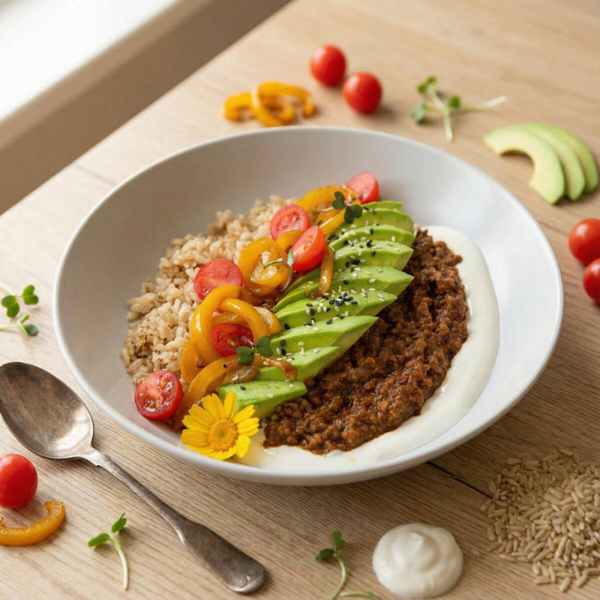 Arroz premium blanco o integral cubierto con carne molida tipo boloñesa cocinada lentamente, pimentón dulce salteado y tomates cherry, finalizado con brotes frescos, cremosa salsa blanca de la casa y aguacate maduro para un plato rico, reconfortante y perfectamente equilibrado.