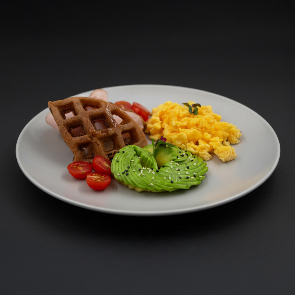 Un desayuno equilibrado estilo casa que incluye aguacate cremoso, jamón de pavo magro, huevos suaves y una crujiente waffle de yuca, acompañado de tomates cherry, brotes frescos y una delicada pizca de semillas de sésamo para un inicio del día nutritivo y satisfactorio.