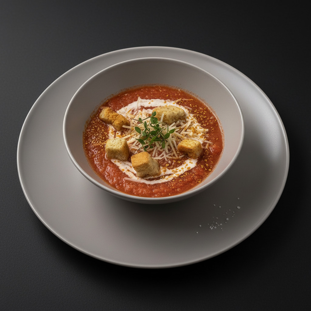 Una crema sedosa elaborada con tomates frescos y conservados, enriquecida con crema fresca y parmesano rallado, finalizada con crutones crujientes y delicados brotes, ofreciendo un equilibrio armonioso entre frescura, profundidad y confort.