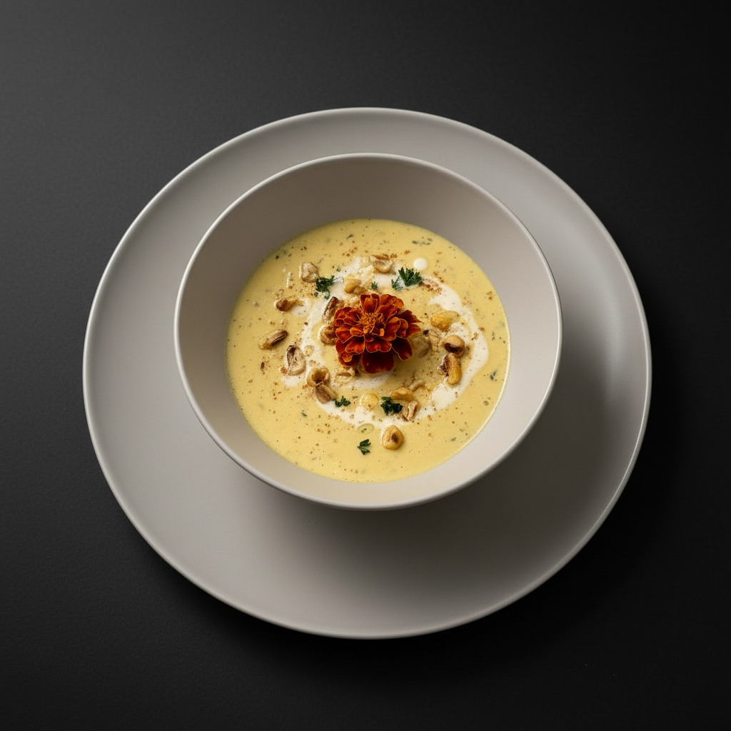 Una suave crema de maíz dulce enriquecida con crema fresca, infusionada con parmesano rallado y granos de maíz tostados, que brinda un equilibrio reconfortante de dulzura natural, cremosidad y un delicado crocante.