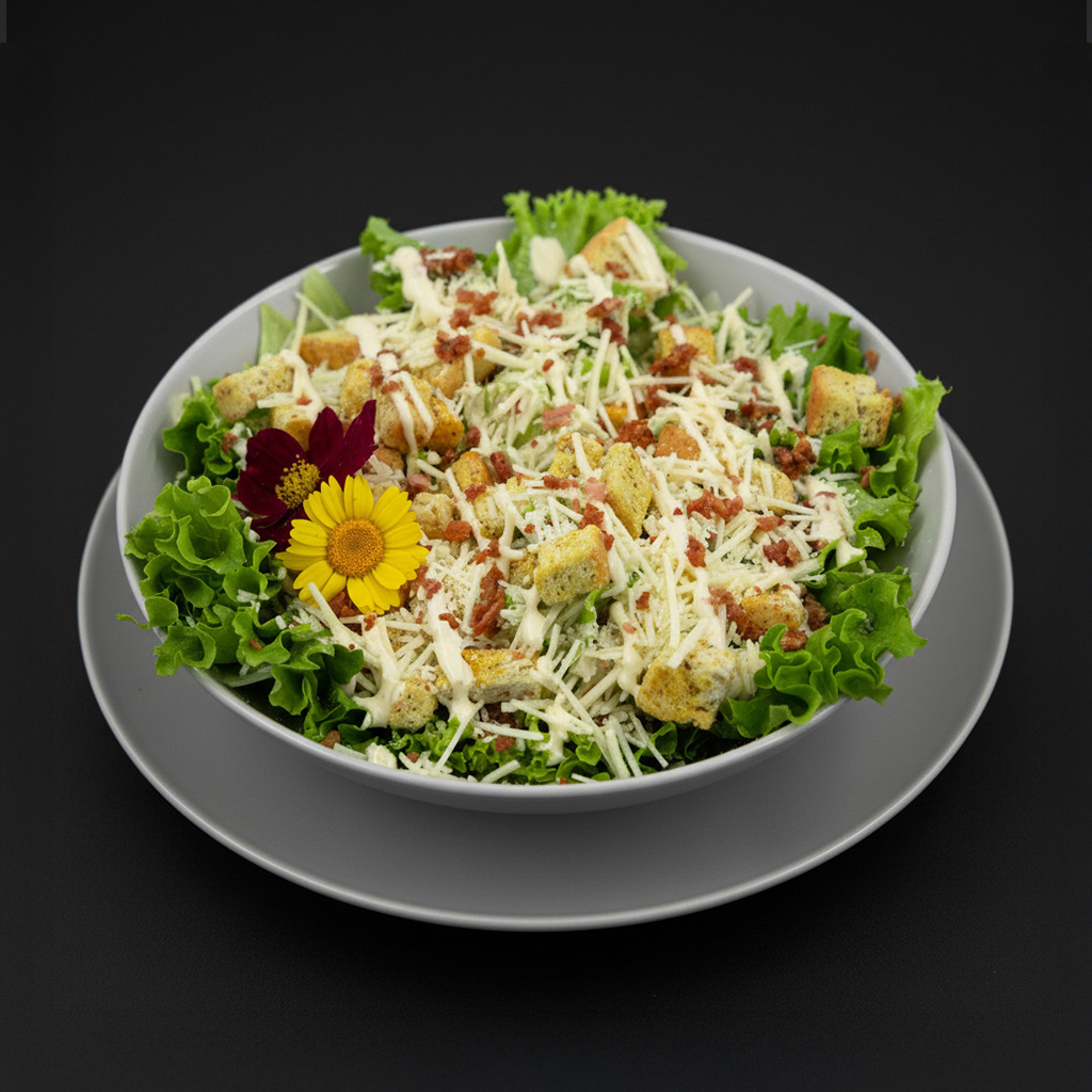 Crujiente lechuga fresca acompañada de parmesano finamente rallado, crotones dorados al punto perfecto y tocineta crocante, todo envuelto en una cremosa y delicada salsa César que realza cada bocado con sabor intenso y equilibrado. Premium white or whole-grain rice topped with tender chicken in a creamy mushroom sauce, paired with cherry tomatoes and sweet cubed plantain, and finished with sprouts
