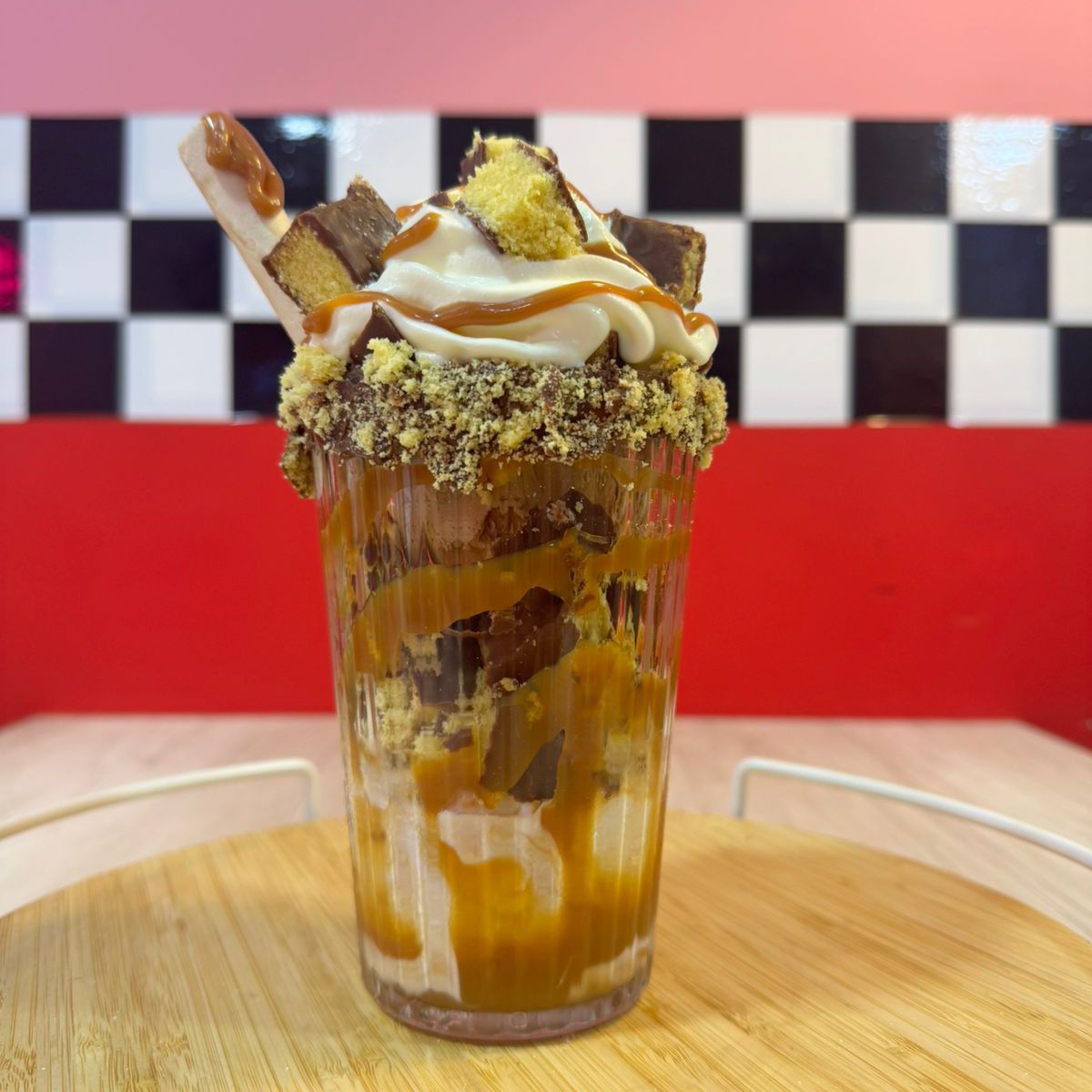 Banano, fresas, Crema Chantilly, Barquillos, 3 Bolas de Helado, 2 salsas y 1 topping a elección.