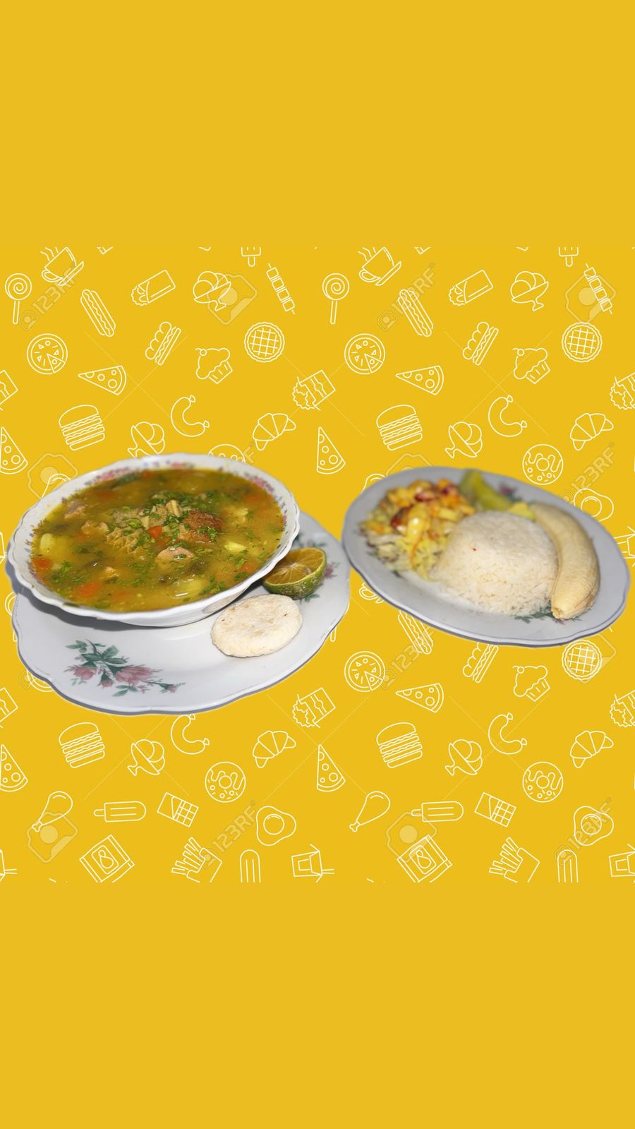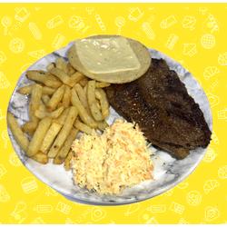 Carne al gusto, sopa del día, carne, arroz, ensalada del día, frijol, papa a la francesa y tajada de maduro.