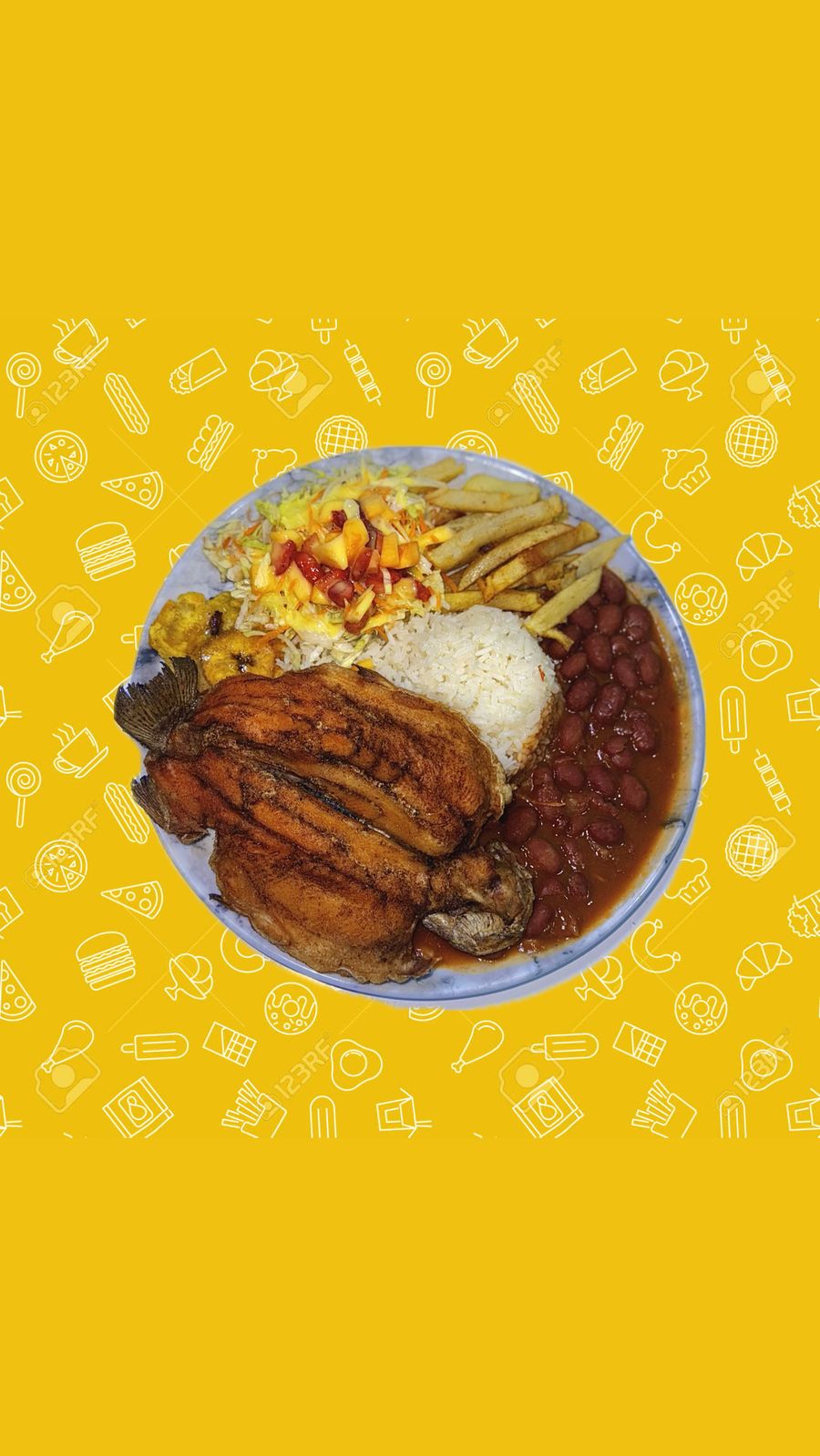 "Bandeja de cerdo acompañada con arroz, frijoles caseros, ensalada fresca del día, crujientes papas a la francesa y una dulce tajada de maduro.