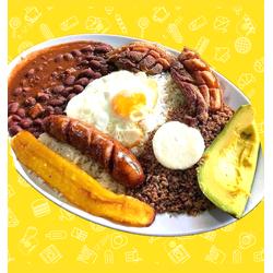 Carne molida, chicharrón, chorizo, huevo, arroz, frijol, ensalada, tajada y aguacate.
