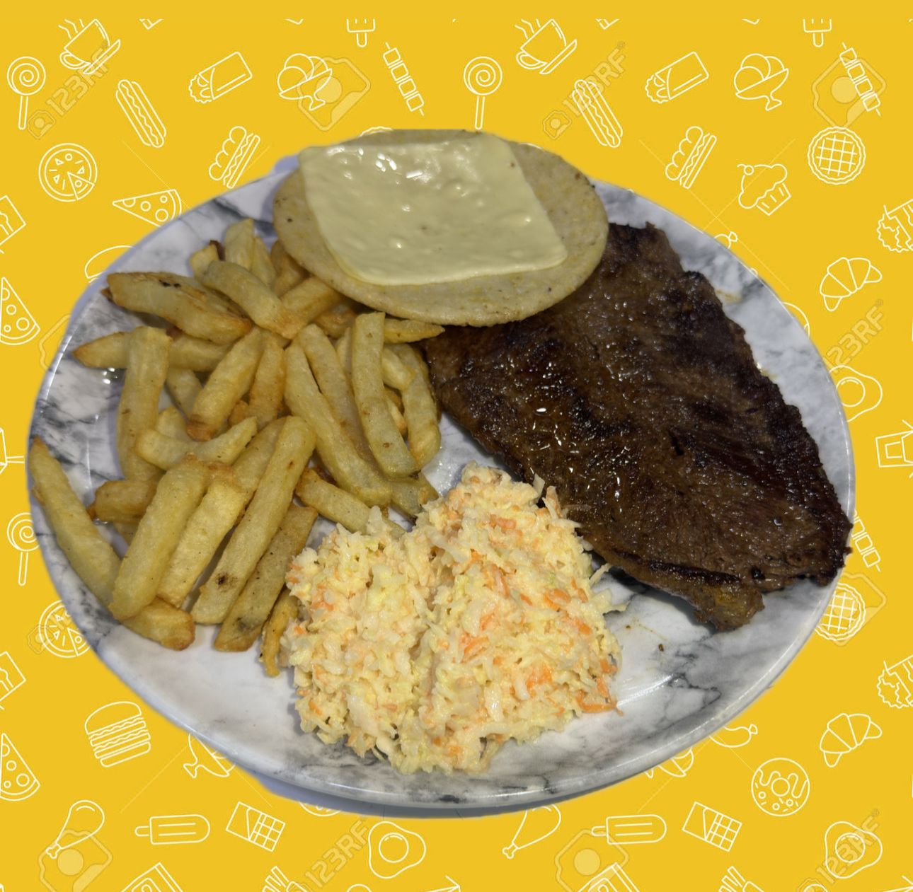 Acompañado de papas a la francesa, arepa y ensalada.