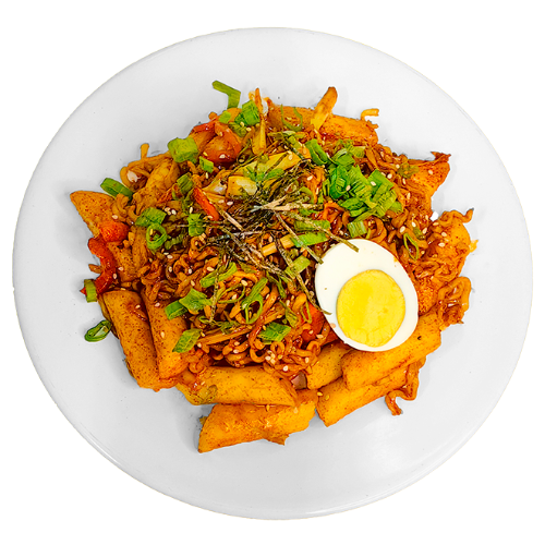 Un plato favorito de todo coreano. 15 unidades de masitas de arroz, acompañado de fideos, verduras y huevo duro, rebosadas en salsa coreana gochujang picante.