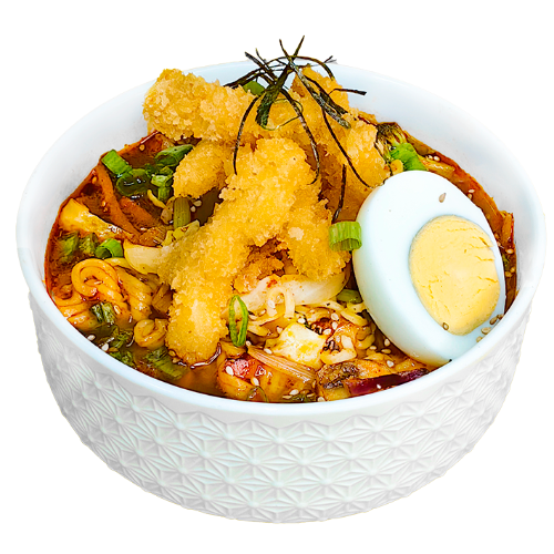 Sopa de fideos con verduras y especias coreanas, acompañada de huevo duro y 4 camarones katchu (apanado y frito).