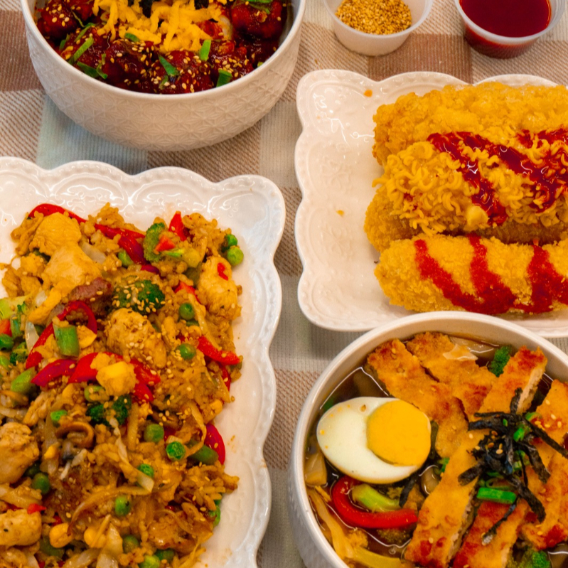 Un banquete para compartir, inspirado en la tradición hansik de corea: todo en el centro, todo para todos.elige tu ramen (pollo, cerdo, camarón o koroke) y el nivel de picante que prefieras.incluye arroz salteado con pollo y cerdo, nuestro pfc bañado en salsa gochujang, y cuatro corn dogs para acompañar. Contiene salsa de ostras.