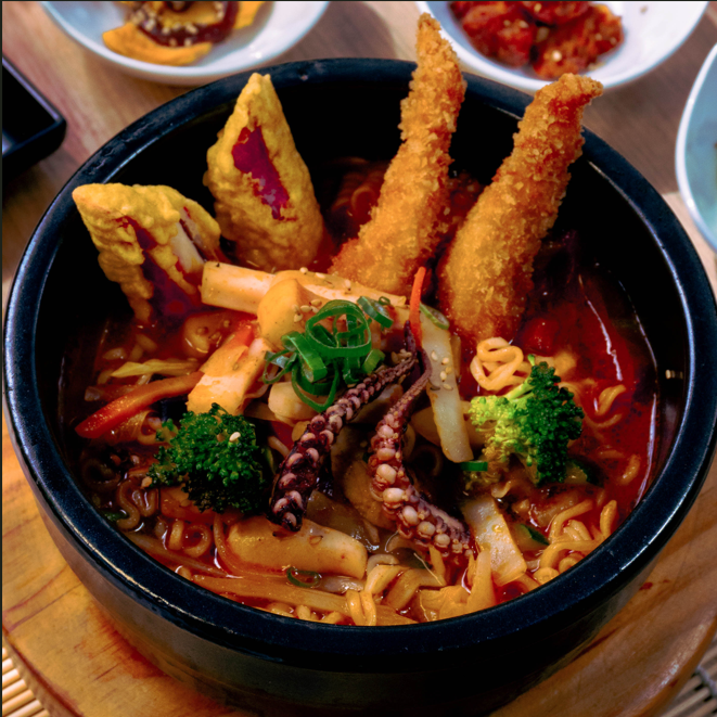 Sopa llena de sabor con especias coreanas, fideos instantáneos como los que se usan en corea, vegetales salteados,palmito de cangrejo, calamar, camarón apanado y un toque de salsa de ostras. en corea, invitar a alguien a comer ramen puede ser más que solo comer